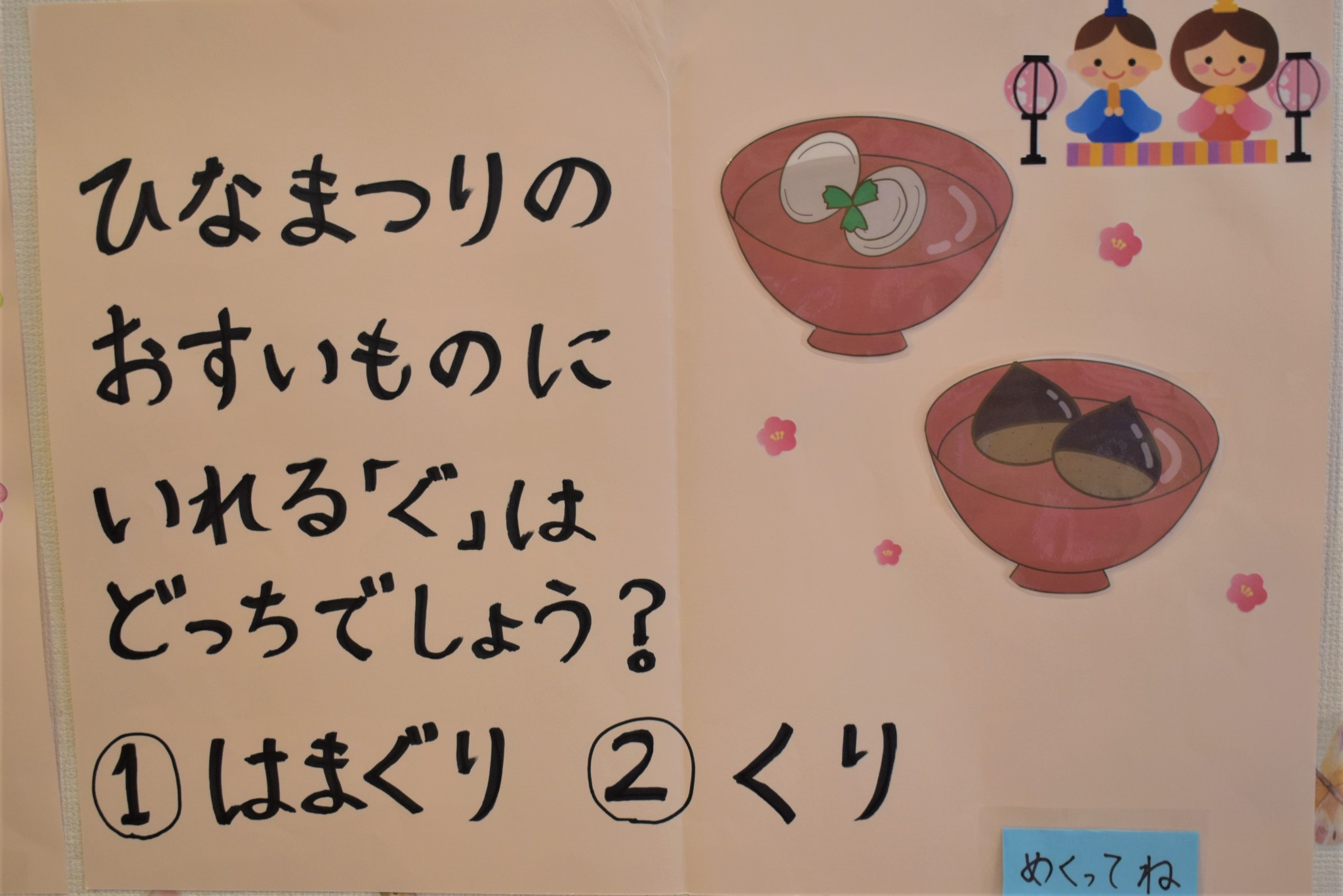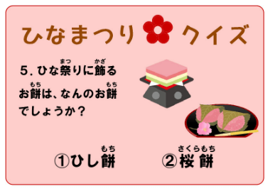 ひな祭りクイズを行うことで、季節の行事に親しんでもらうことと基礎的な知識を得てもらうことを目的とする。