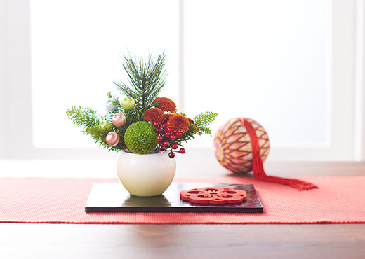 花材と器選びで差がつく!洋風リビングにもマッチするお正月の特選アレンジメント。