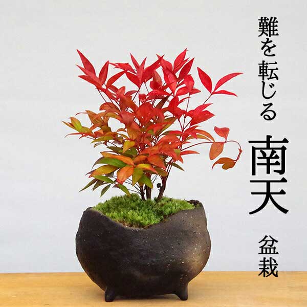 美しい南天の紅葉をモスモスが眺めています 南天 なんてん の苔玉・黒備前器・モスコトリ2匹・受け皿・天然孟宗飾り台セット。