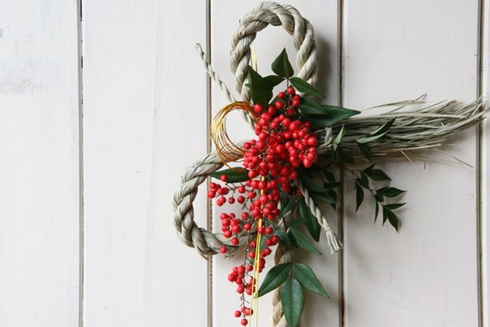 生花 ナンテンと松のお正月飾り しめ縄リースアレンジ。