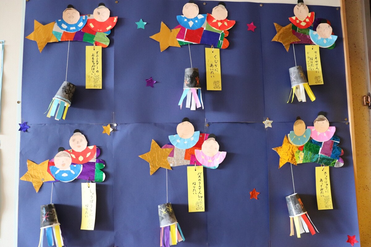 七夕の壁面製作 年長児 折り紙で彦星と織姫を作りました☆ふじおか幼稚園の楽しい保育。