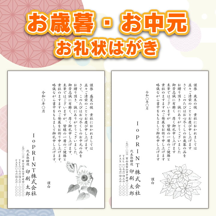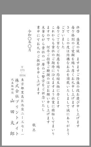 お礼状 お中元・お歳暮 ビジネス用はがき例文即日印刷プリントメイト。