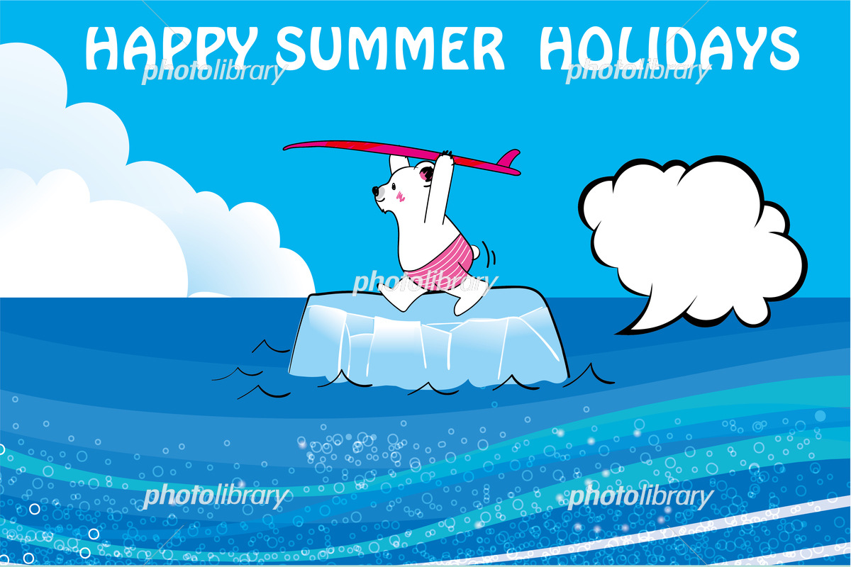 そのまま使える暑中見舞いのかわいいイラスト テンプレート 流氷の上でサーフボードを持つシロクマ横 イラスト素材6437478-フォトライブラリー photolibrary。