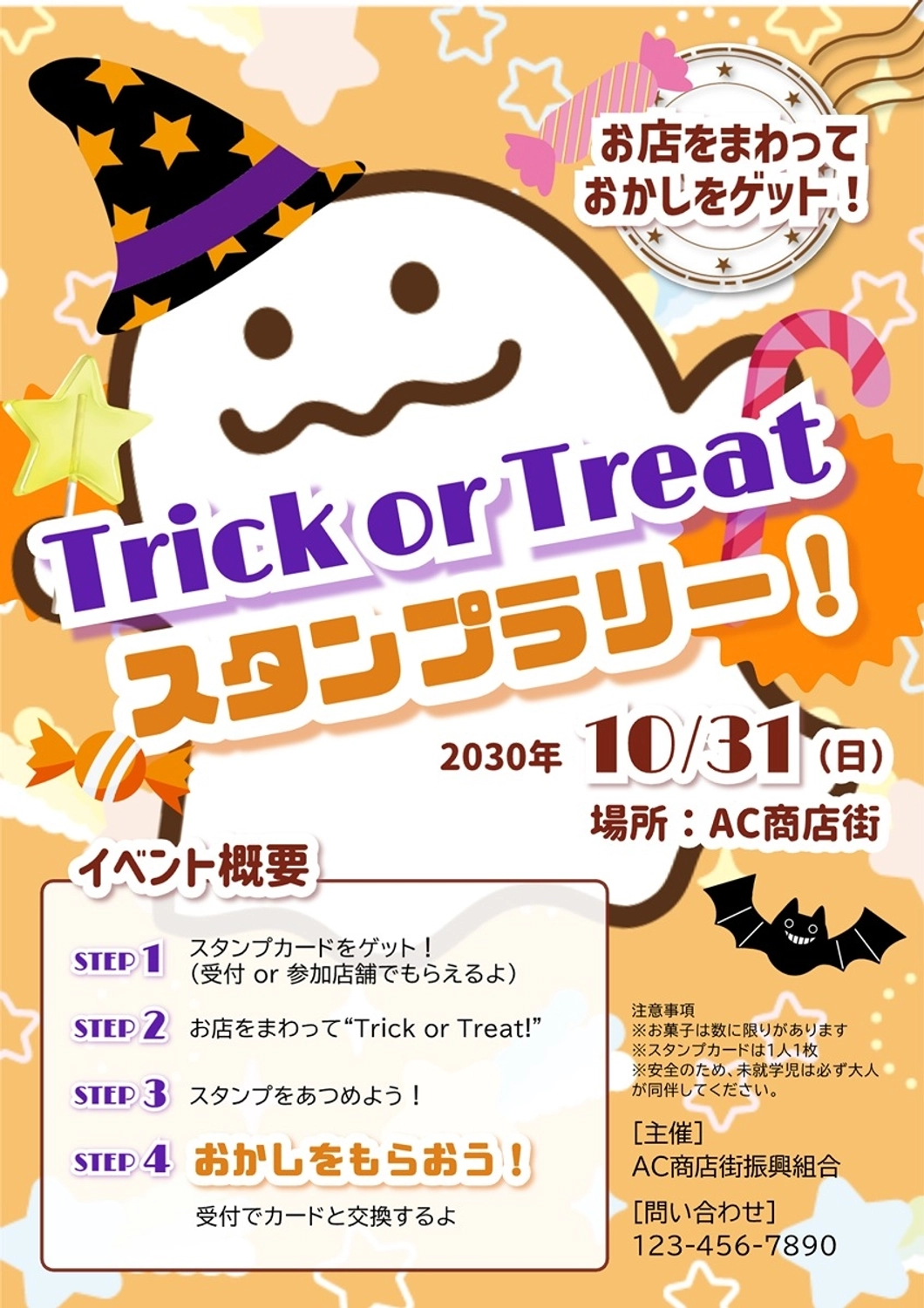 商店街の子ども向け仮装スタンプラリーの案内ポスターチラシの無料チラシテンプレート 14639 - デザインAC。