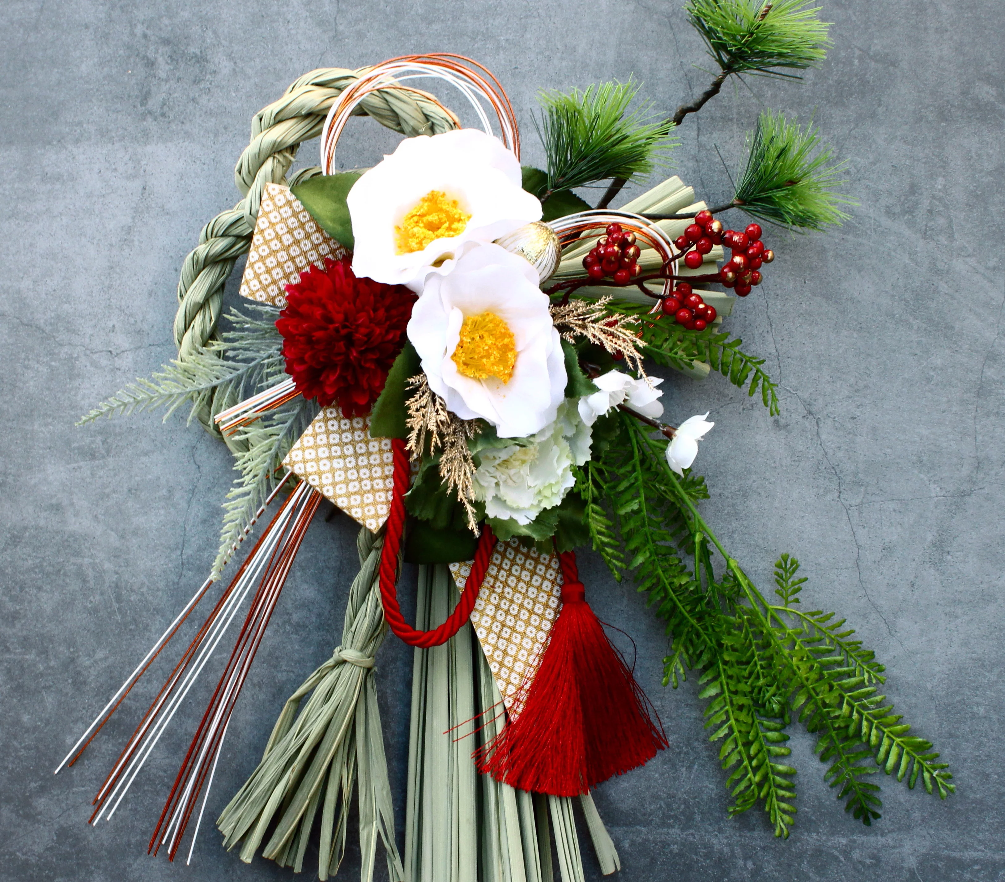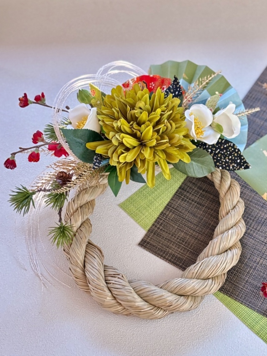 お正月アレンジ2025♡和モダンしめ縄飾り 〜アーティフィシャルフラワー・ちりめんデザイン〜Fla-co フラコ- フラワーアレンジ作品投稿サイト。