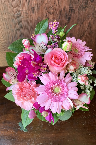 ひな祭りのアレンジメント 桃の花とガーベラ、スイトピーでピンク系にお花選びのコンシェルジュ。