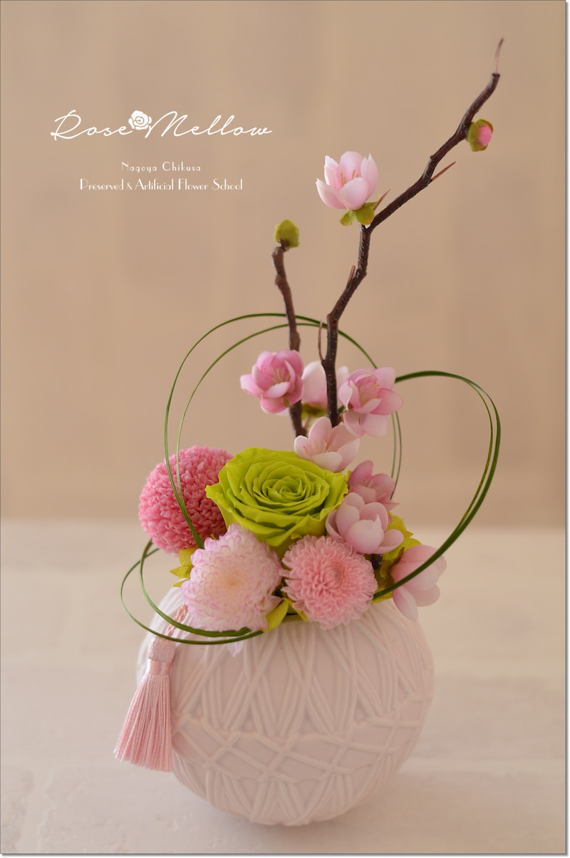 むぎデザイン工房 トピックス プリザーブドフラワー講座 ピンポンマムの雛祭りアレンジ。