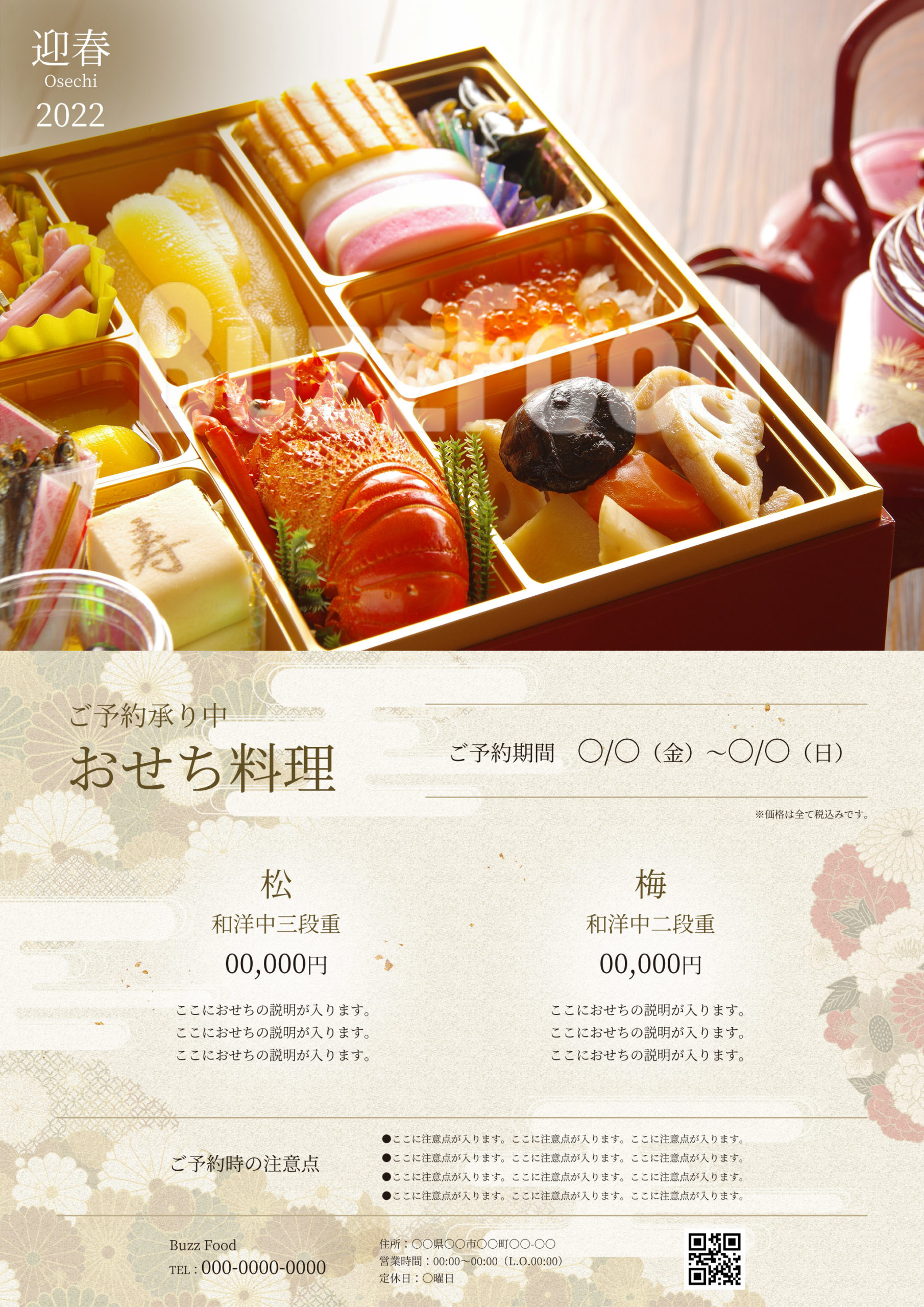 おせち料理チラシ 和食や居酒屋にオススメ カラー:ベージュ 縦レイアウト - BuzzFood。