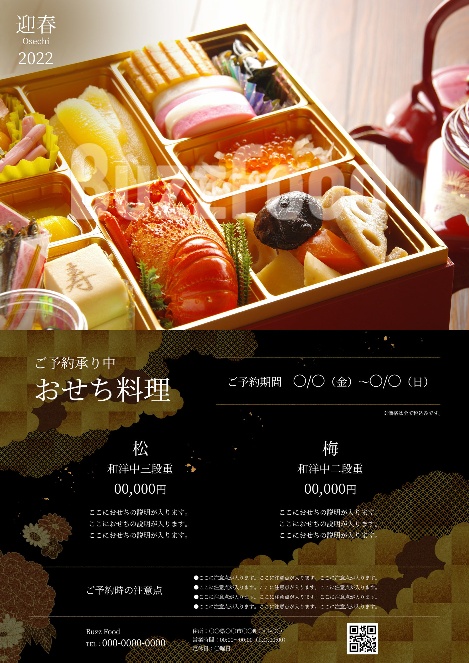 おせち料理チラシ 和食や居酒屋にオススメ カラー:黒・金 縦レイアウト - BuzzFood。