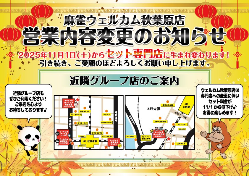 麻雀ウェルカム 公式on X: "🀄麻雀ウェルカム秋葉原店 営業内容変更のお知らせ🀄 2025年11月1日 土 から、麻雀ウェルカム秋葉原店は「セット専門店」に生まれ変わることになりました✨11 1以降はセット料金が値下げし、お得に麻雀を楽しめます♪ 引き続きご愛顧の。