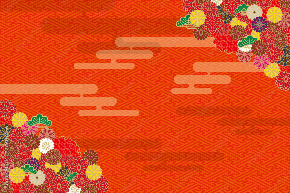 Photo Stock 着物のイメージの正月用背景 和柄 赤:年賀状素材 工字繋ぎ文様と菊と雲の柄Adobe Stock。
