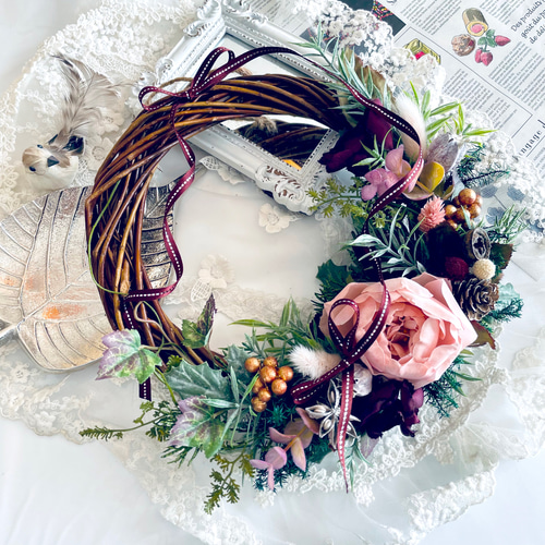 手作りキット*早割クリスマス*お洒落な一年中飾れるニュアンスカラーの薔薇とグリーンのクリスマスリース*無料ラッピングあり リース iko 通販14843824Creema クリーマ。