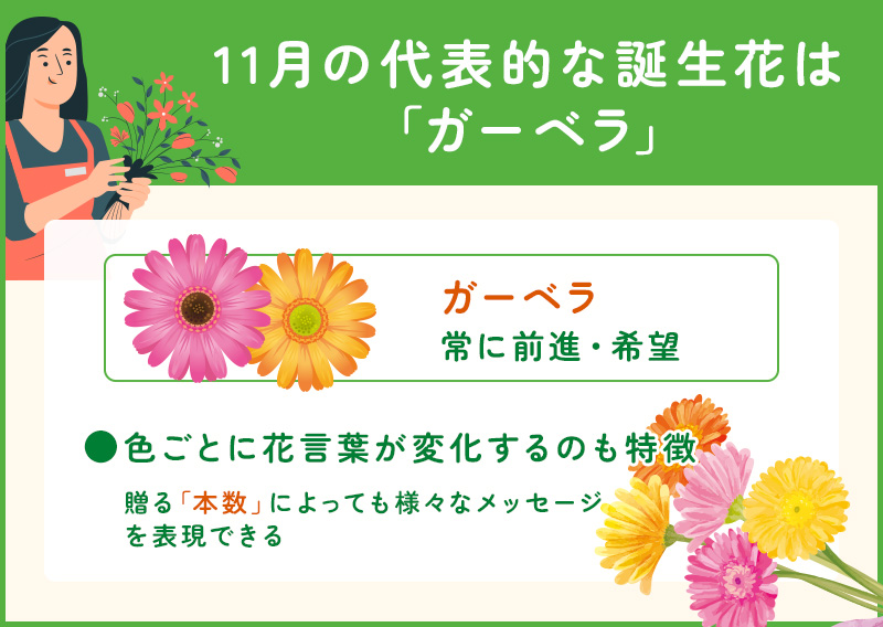 11月の誕生花 ガーベラ◇花言葉は「希望・常に前進」。