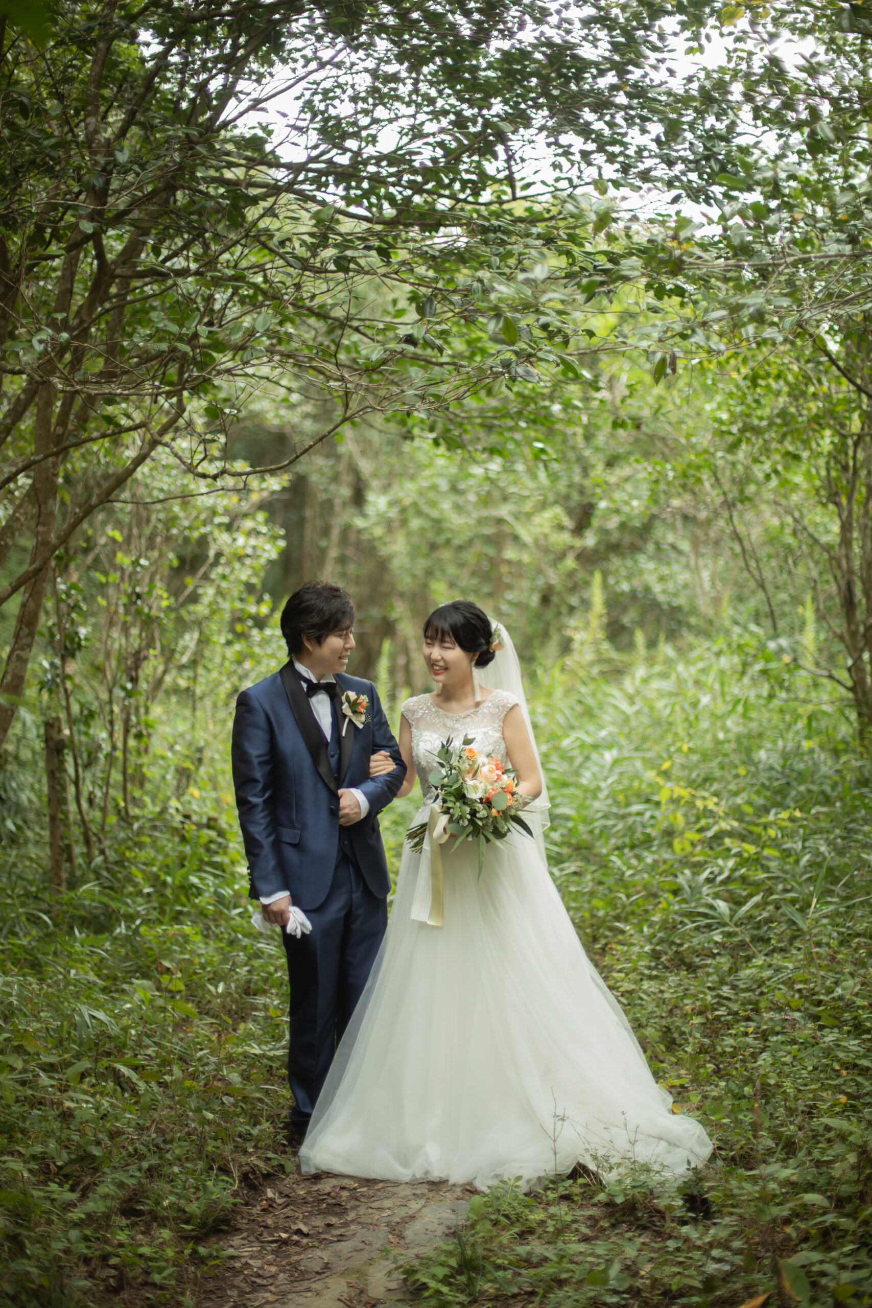 雨の日の、緑輝く前撮り撮影表参道のウェディングアベニュ。