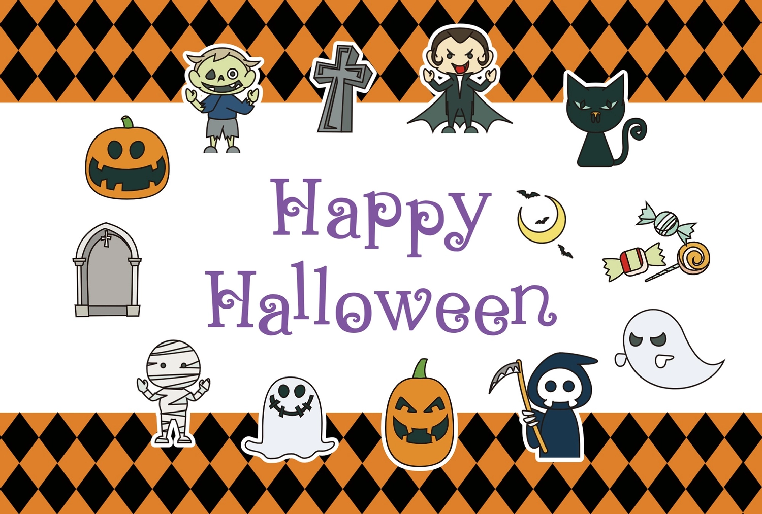 ダイヤ柄の枠にハロウィンイラストのメッセージカードの無料メッセージカードテンプレート 14877 - デザインAC。