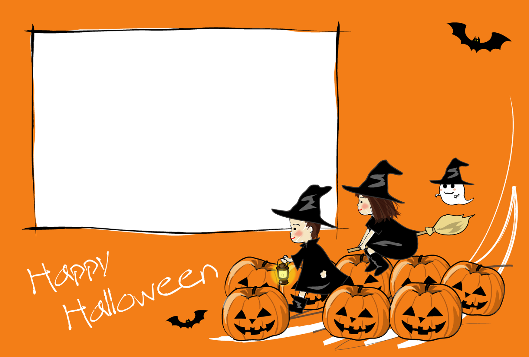 ハロウィンのポストカードテンプレート「写真フレーム・子どもとかぼちゃ」ダウンロードかわいい無料はがきテンプレート はがき絵箱。