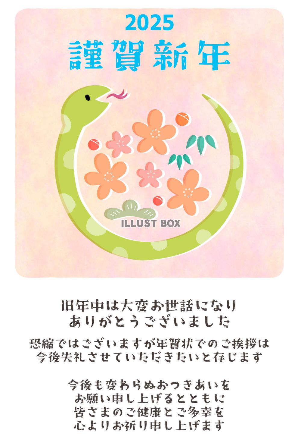 2025年の年賀状じまい 蛇と花の和風デザインと挨拶文付き:イラスト無料。