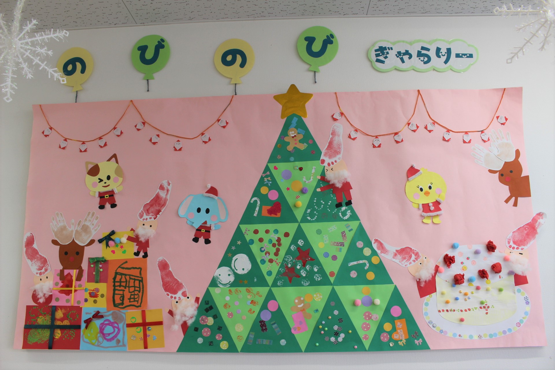 12月の壁面「クリスマスの贈り物」 LaLaほいく ららほいく。