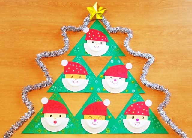 保育園 12月壁面製作 紙皿や折り紙サンタのクリスマスツリー保育士のお仕事静岡。