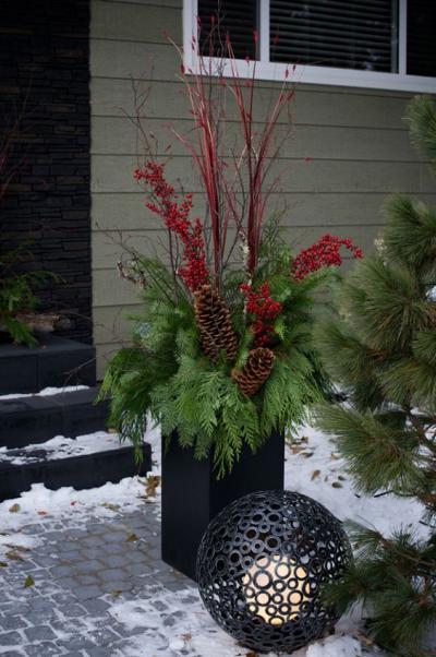 クリスマスシーズンの玄関や窓辺を飾る、プランター&ディスプレイのアイデア21。