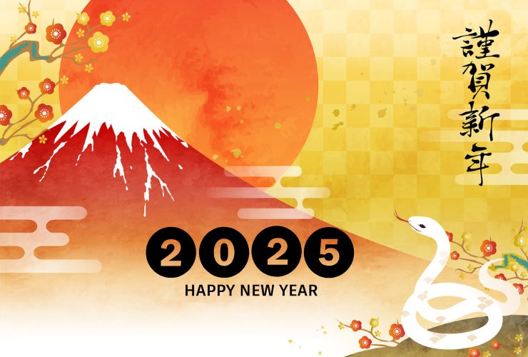 2025年年賀状、謹賀新年の文字と正月イラスト無料イラスト素材素材ラボ。