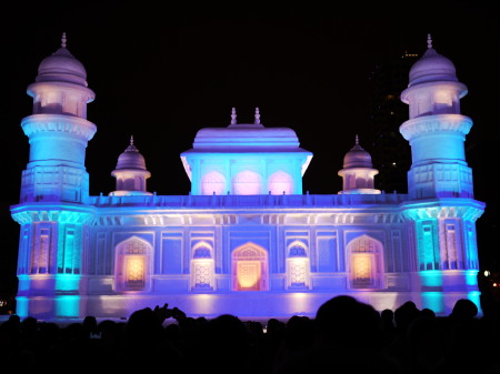 ライトアップされた氷の初音ミクさっぽろ雪まつり 1枚目の写真・画像インサイド。