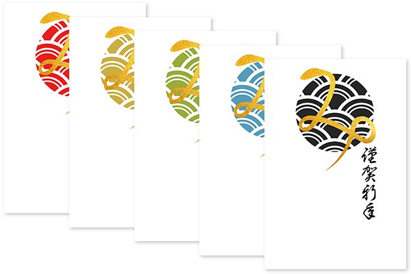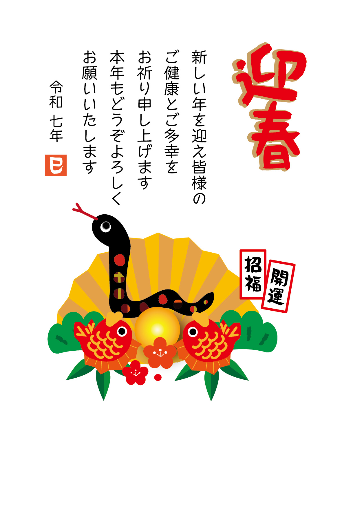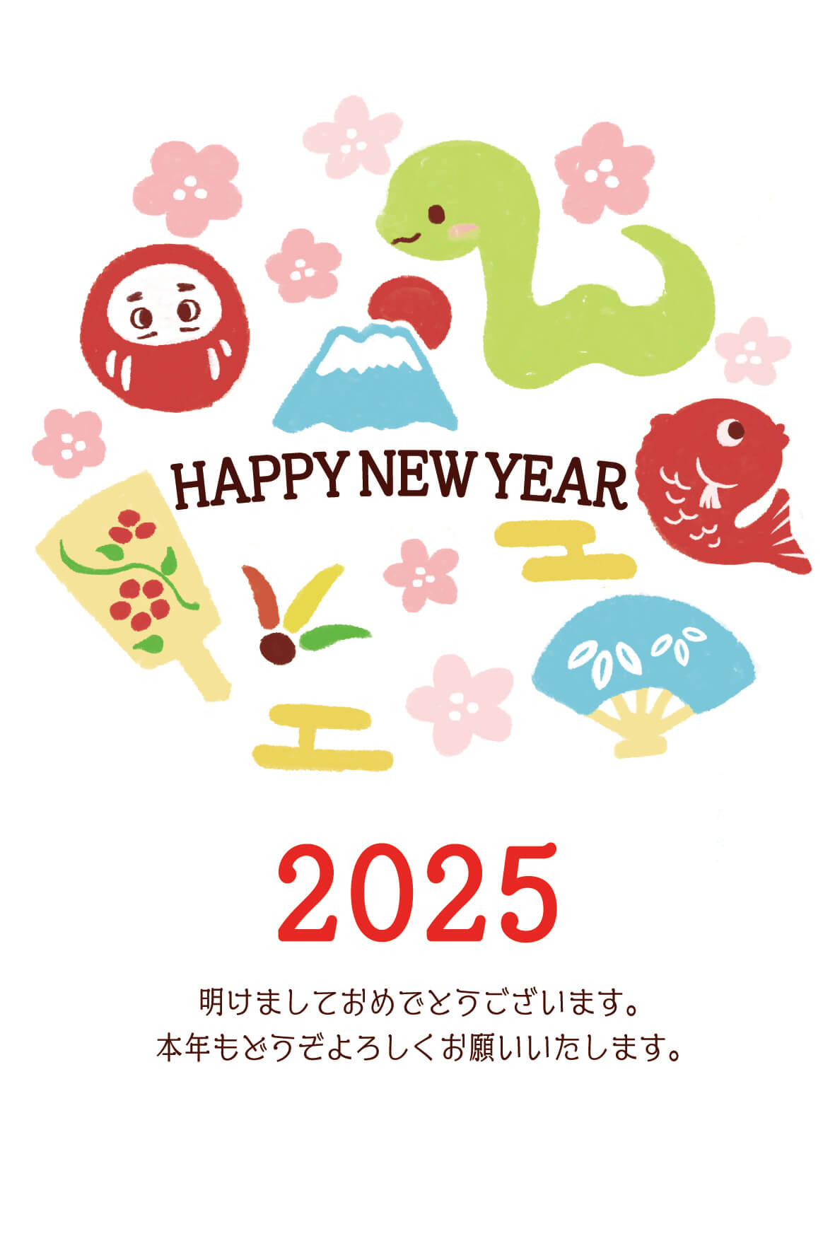 2025年巳年の年賀状テンプレート8縁起物大集合 縦型:イラスト無料。