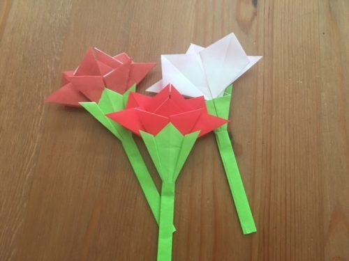 カーネーションの折り紙。簡単に子供でも花束の立体の手作り製作。保育園の子どもや小学生にもおすすめ!おりがみっこⅡ。