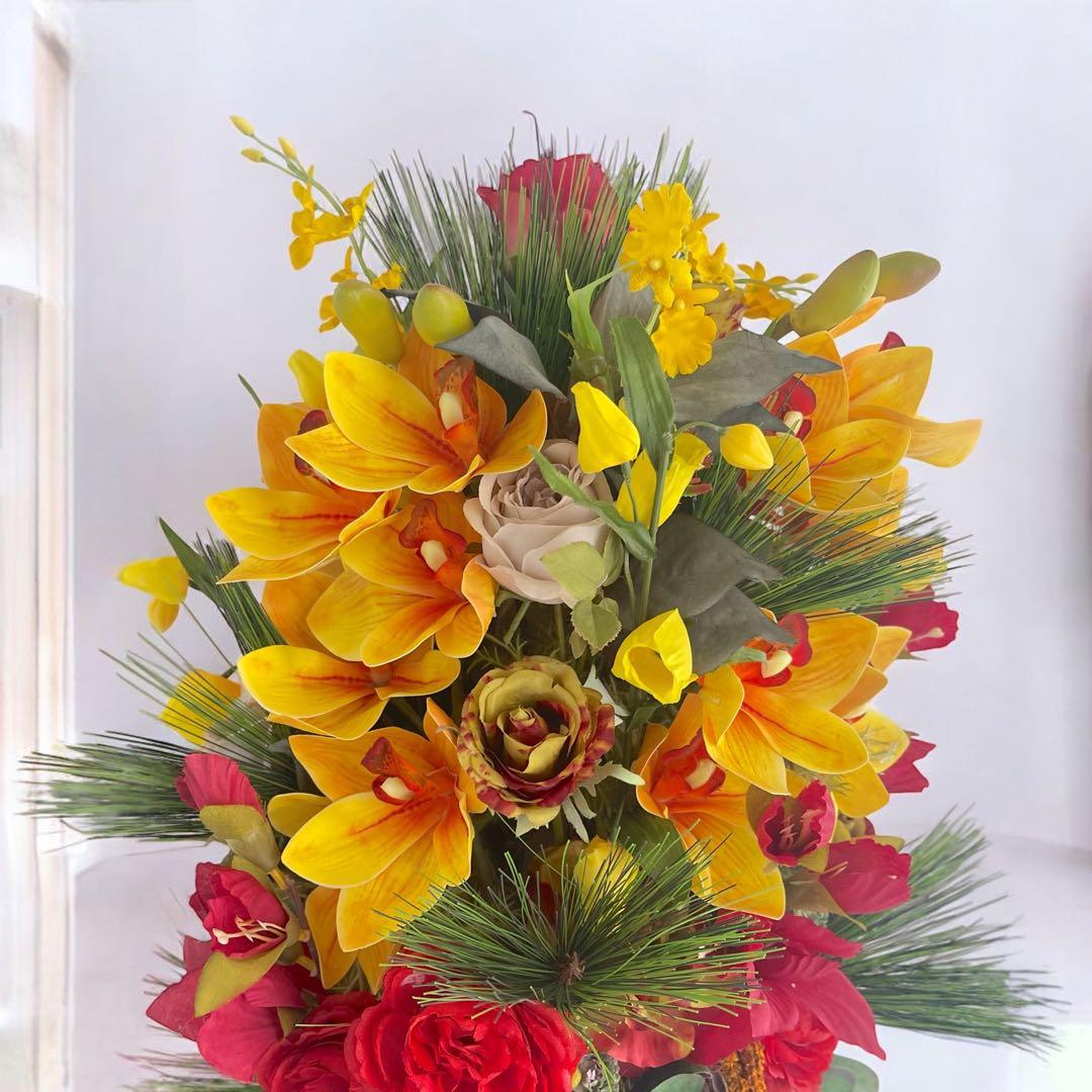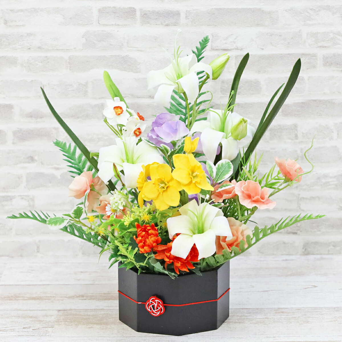 造花 ユリや水仙とスイートピーなどアレンジ お正月 シルクフラワー ゆり リリー 玄関飾り 正月。