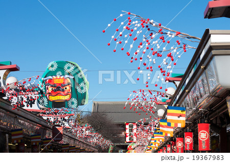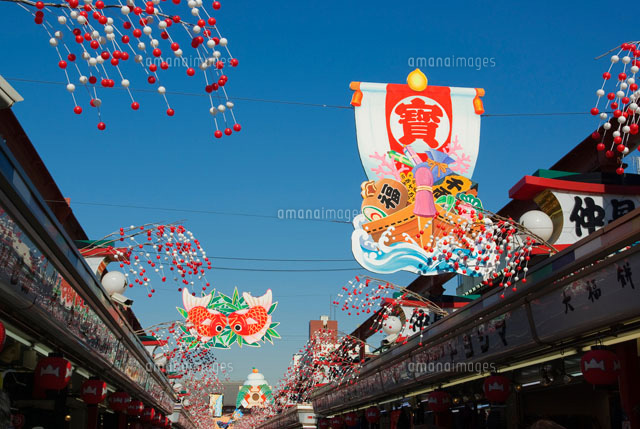 浅草寺仲見世の正月風景 羽子板の飾り 01071010767 の写真・イラスト素材アマナイメージズ。