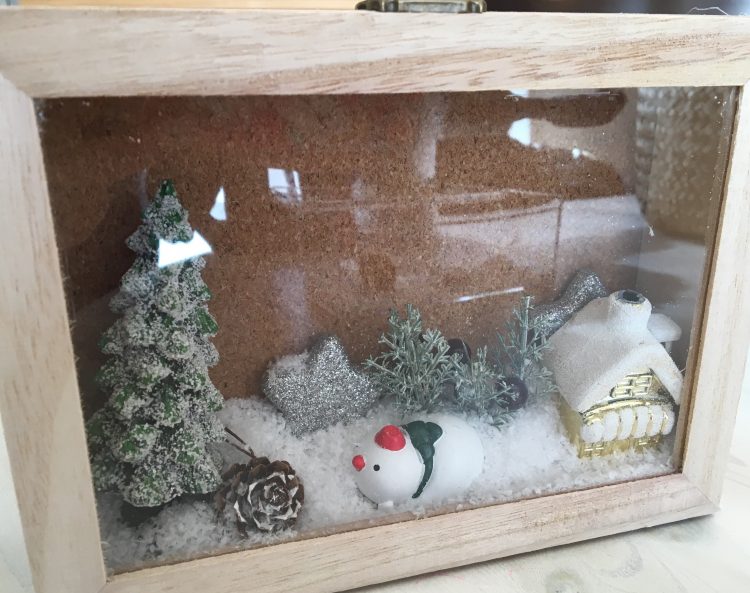 子供と100均クリスマス工作♪セリアやダイソーの小物とケースで簡単♪ 可愛いクリスマスディスプレイBOXの作り方 セリアのスノーパウダーを使ってミニチュア雪景色を作ろう♪雪見日和。