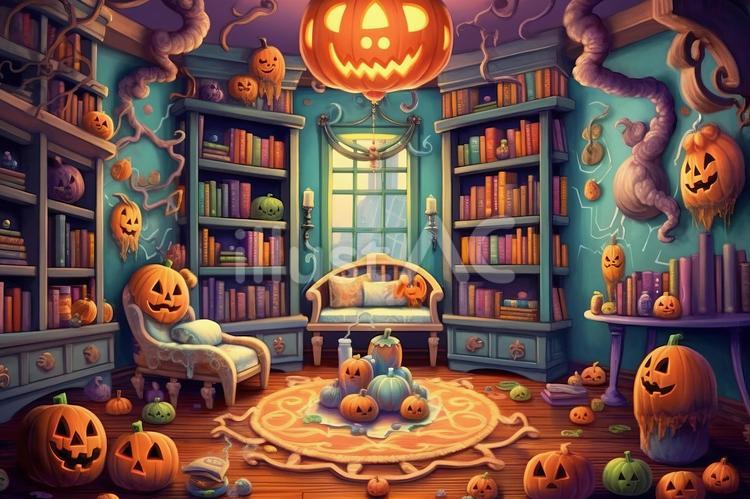 暖炉、カボチャ、頭蓋骨のあるハロウィーンの部屋のイラスト素材・ベクター Image 193165282。