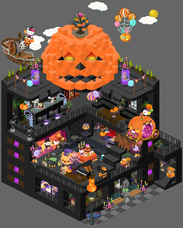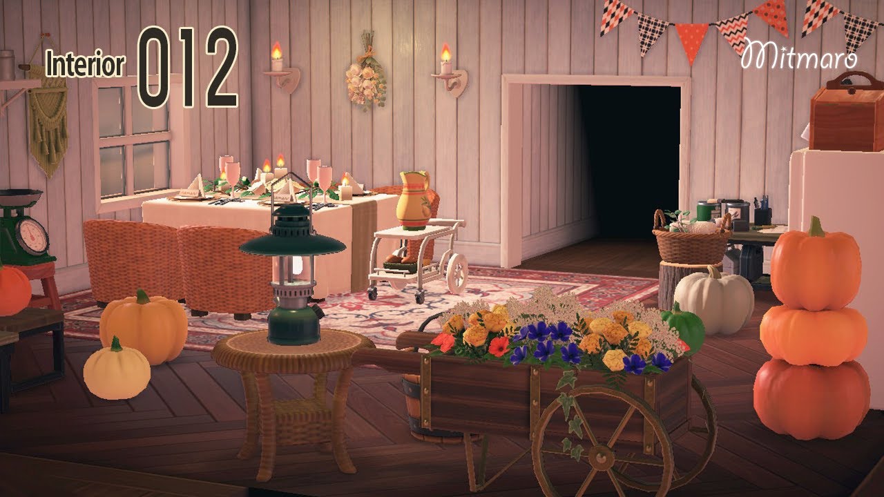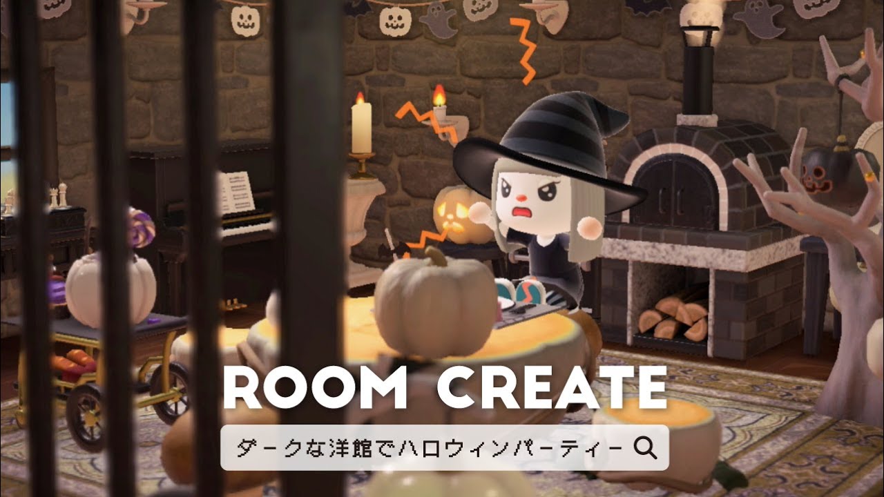 あつ森 ダークな洋館でハロウィンパーティー 部屋レイアウト あつまれどうぶつの森 おしゃれでかわいいお部屋作り モノクロかぼちゃ家具。