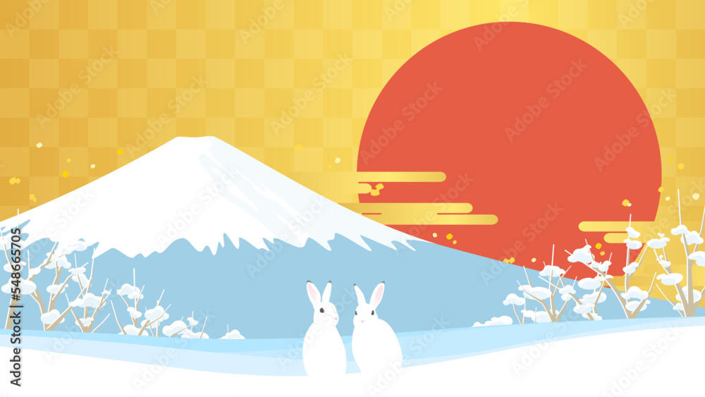 お正月のバナー背景 ウサギと富士山と初日の出のイラスト 2023年 卯年 令和五年 Stock VectorAdobe Stock。