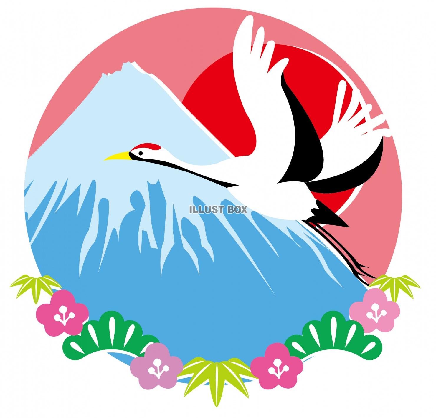 お正月 年賀状 富士山と鶴と松竹梅 カラー:イラスト無料。