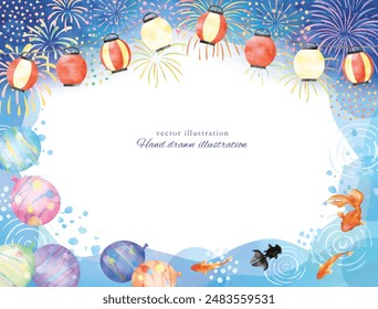 フリーイラスト提灯と花火の夏祭りの飾り枠パブリックドメインQ:著作権フリー画像素材集。