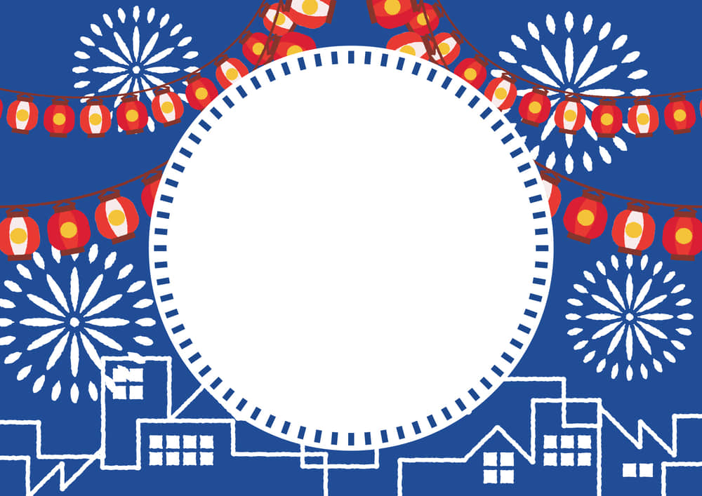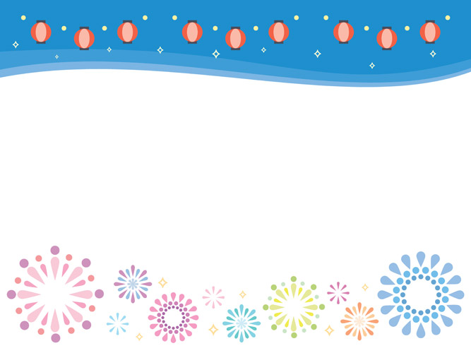 シンプルイラスト無料夏祭り ちょうちん 町並み 花火 青色 フレームイラストダウンロード。