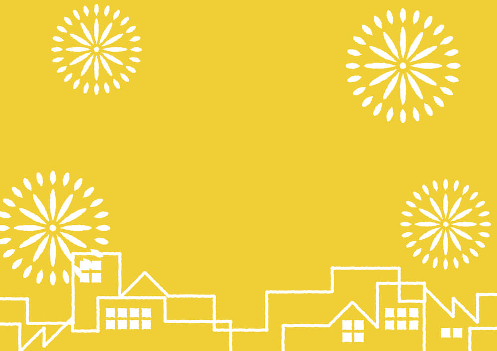 シンプルイラスト無料夏祭り 町並み 花火 黄色 背景イラストダウンロード。