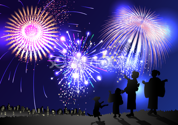 お祭りを楽しむ人達 花火背景 イラスト素材7142629- フォトライブラリ。