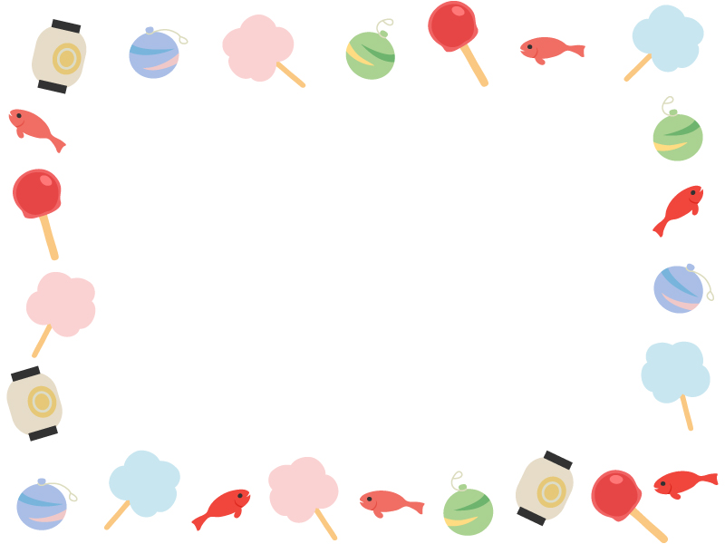 フリーイラスト提灯と綿菓子やリンゴ飴などの夏祭りの飾り枠パブリックドメインQ:著作権フリー画像素材集。