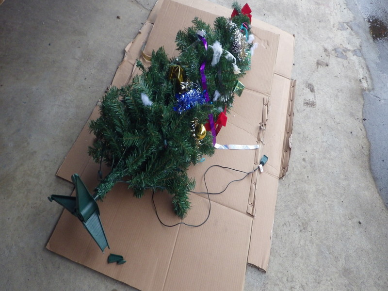 猫によるクリスマスツリー被害状況。ついに倒壊しました。