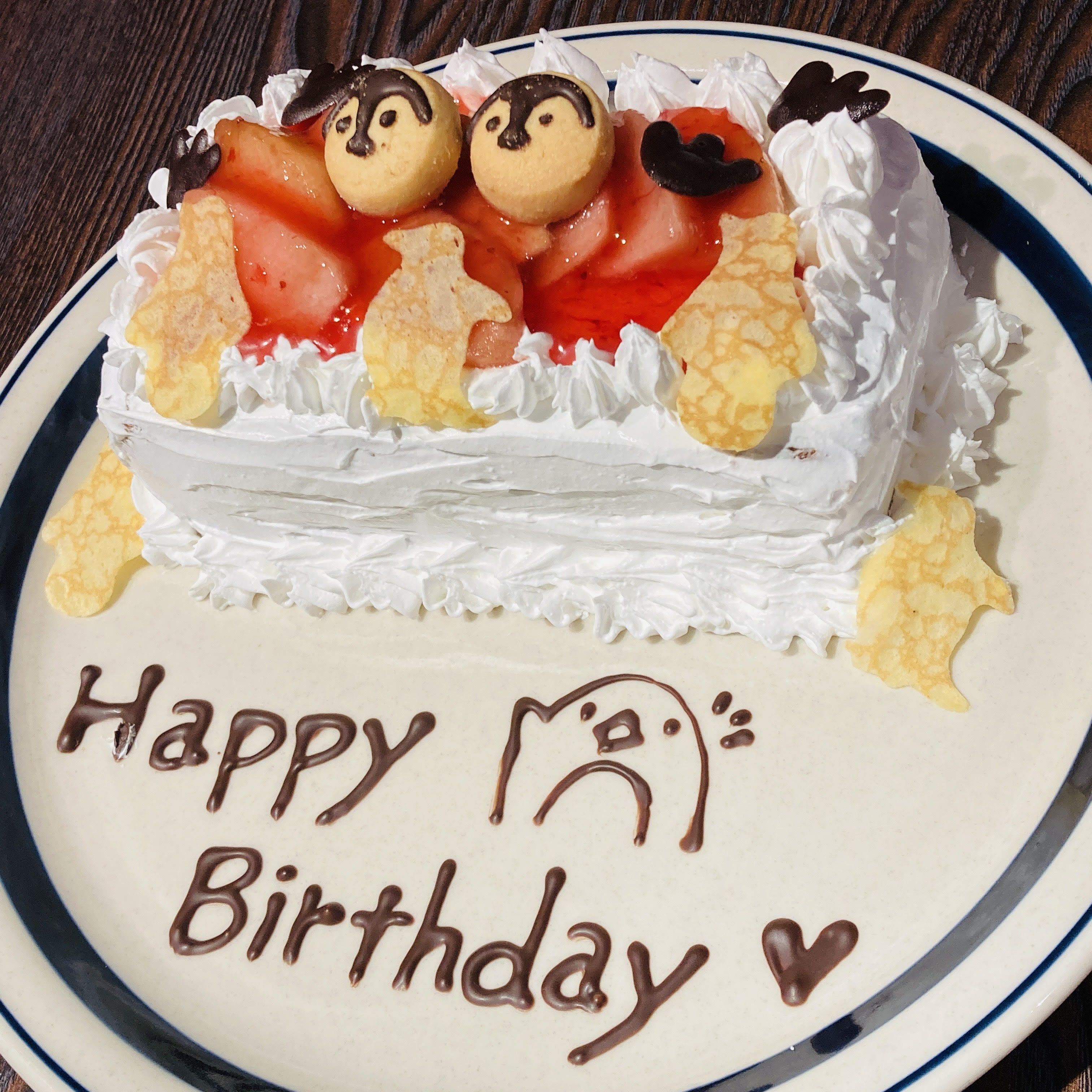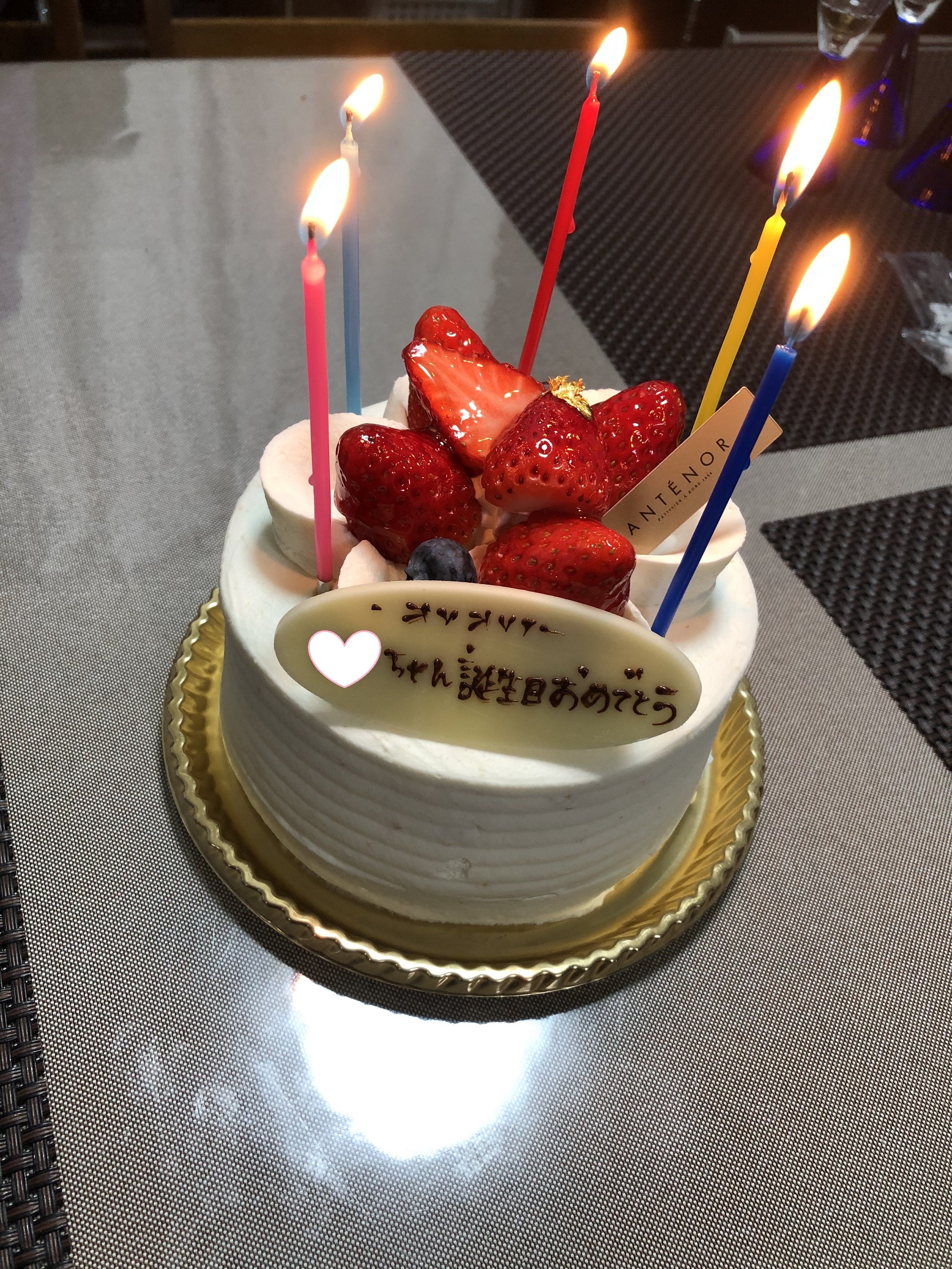 今日は旦那さんのお誕生日。, ケーキのプレートに「何て書きましょうか?」, と聞かれたので文章はこのまんま伝えたら、, 全部ひらがな💦,ニコちゃんマークまで書いてくれて、、, 完全に子供用って思われてた😆, ロウソクも「何本にしましょうか?」って, 聞かれたけど59本とも言えず😅,とりあえずお飾り程度いただきました🎂, 今日も仕事だった旦那さん、お疲れ様!, そしてお誕生日おめでとう,。