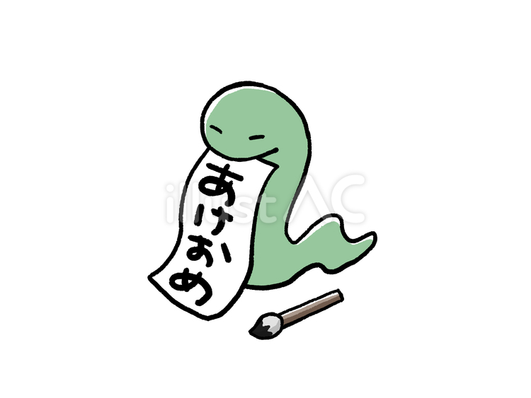 28_2025年年賀状_巳年・あけおめの筆文字を書く蛇 縦型:イラスト無料。