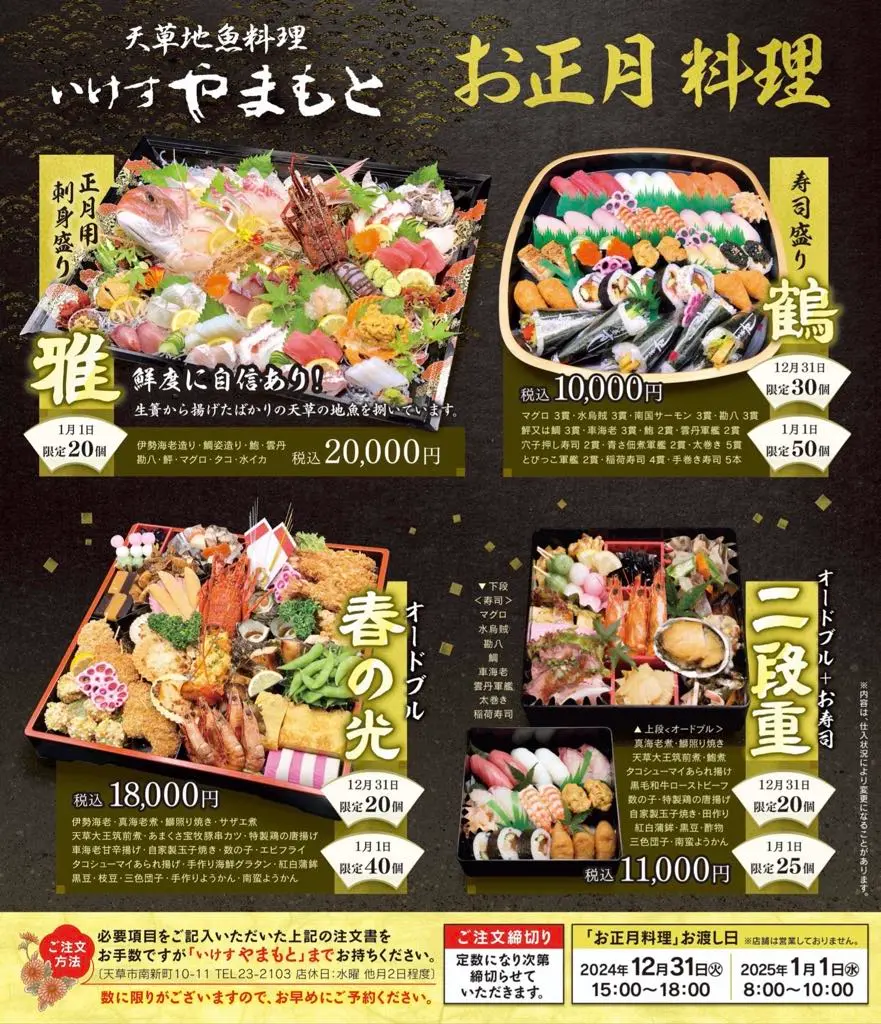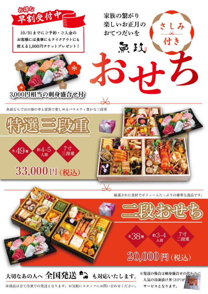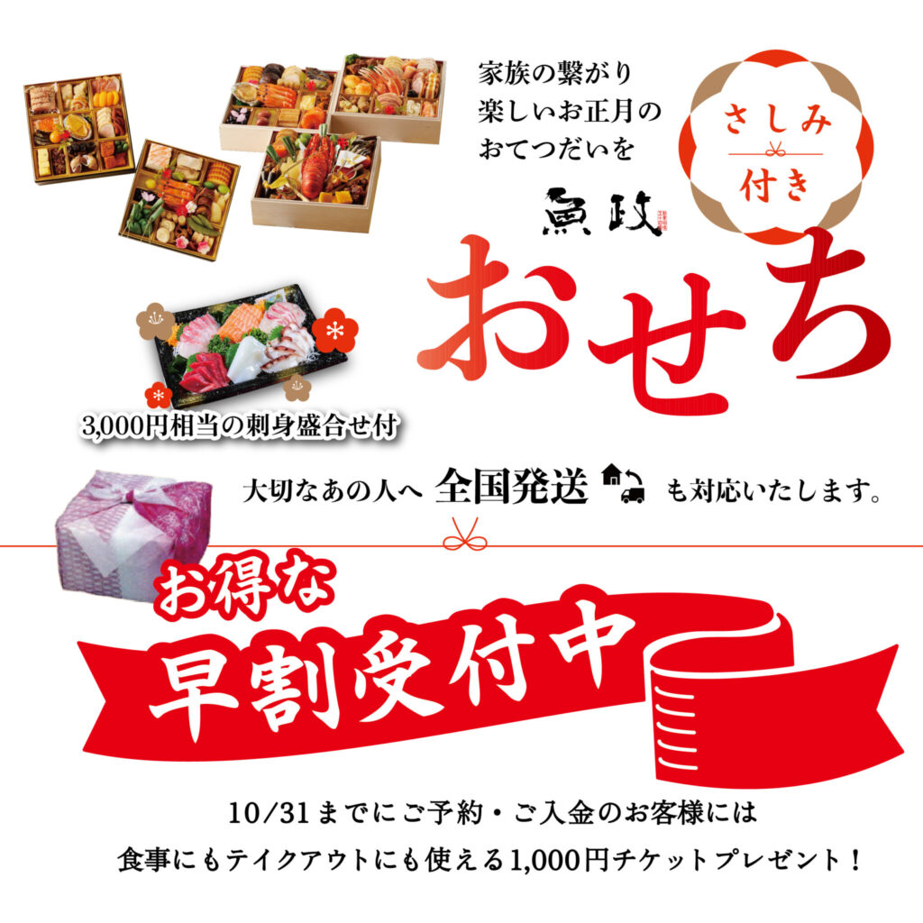 魚政のお料理で特別な年越しを。人気の「刺身付き」おせち2024予約受付開始。店頭とモバイルオーダーでご予約、ご入金でお得な早割受付中です!福岡久留米うおまさ。