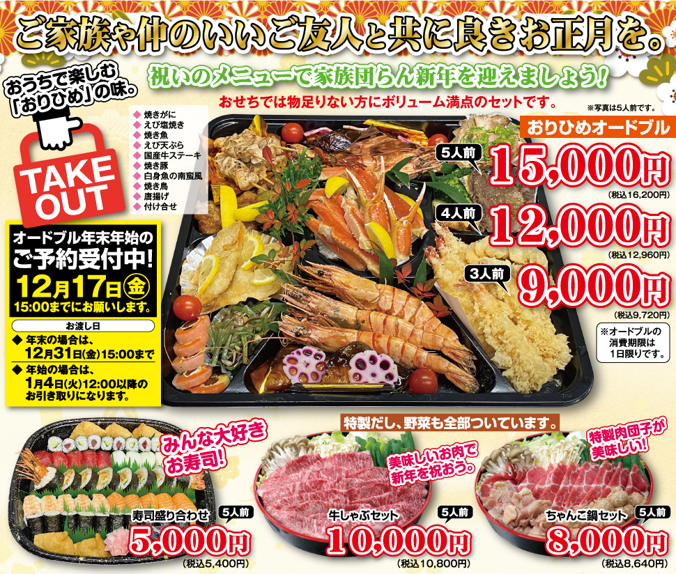 2024年お正月のおせち料理・お寿司・オードブルのご予約承ります海鮮うまいもん屋 てっぺん。