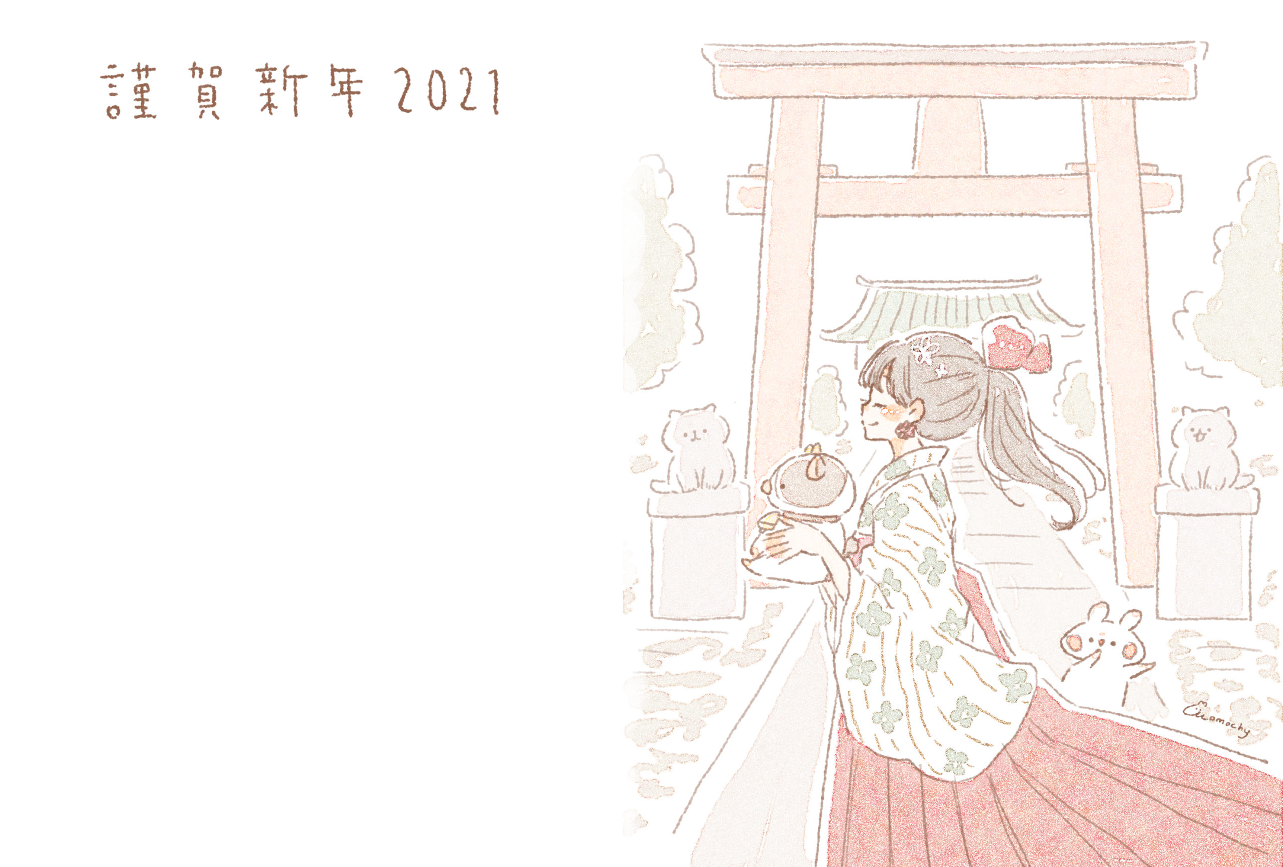 2021年 丑年 おしゃれでかわいい年賀状デザイン無料配布❁20 着物の女の子のお正月遊び 横momochyのおうちイラストレーターももちーのWebサイト。