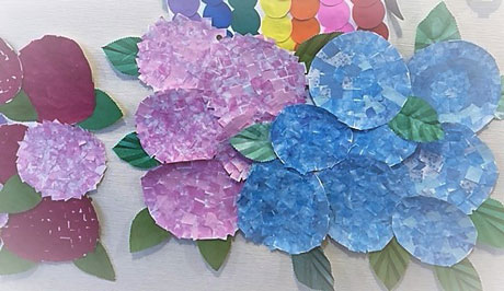 6月の花 工作 雨と紫陽花をモチーフにした飾りを高齢者レクで作ろう 壁面飾りにもshigeyuki.net。