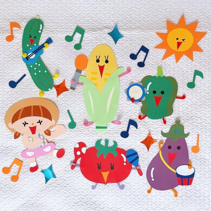 壁面飾り キラキラ壁面 夏 7月壁面 8月壁面 8月号掲載!夏野菜アイデア✂✨ 先月の「撮影チラ見せ」に登場した、 かわいい夏野菜たち🍅🍆🥒本日は、この子たちの部屋飾りプランを ちらっとご紹介します👀❢ 鮮やかな黄色い地面に、 カラフルな野菜と青空が映えますね。