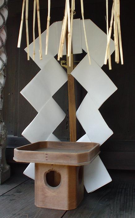 御幣、幣束、幣帛などと言われる幣串に紙垂を挿したもの 幣束立て - 神棚 上敷き 簾の専門店 おまかせ工房 ブログ。