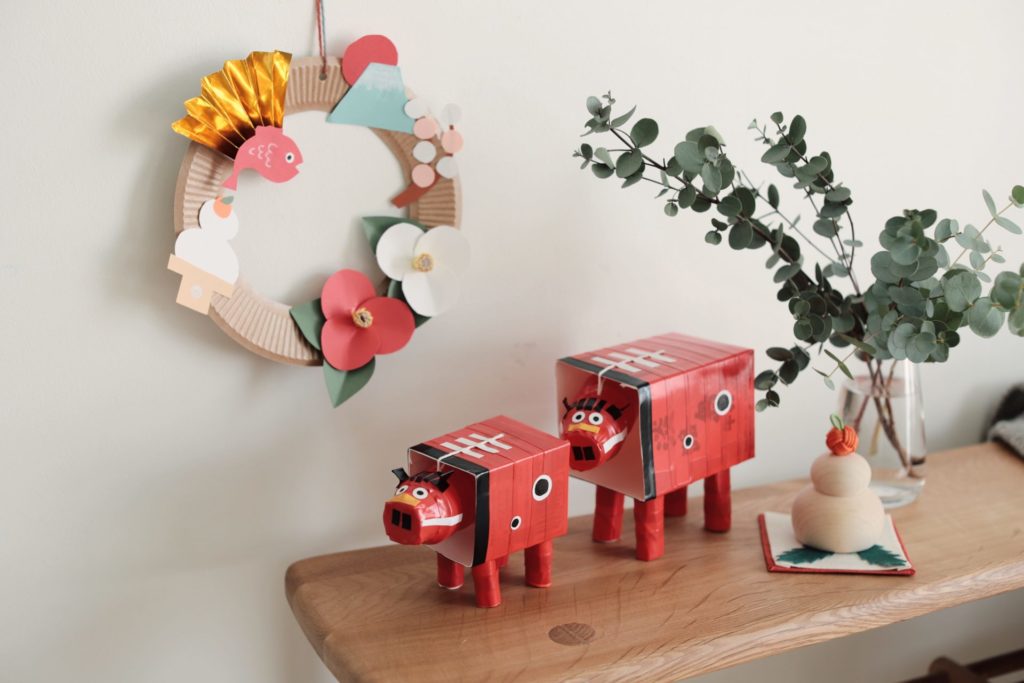 身近な材料でお正月飾りづくり〜「牛乳パック赤べこ」と「おめでた紙皿リース」つづる。